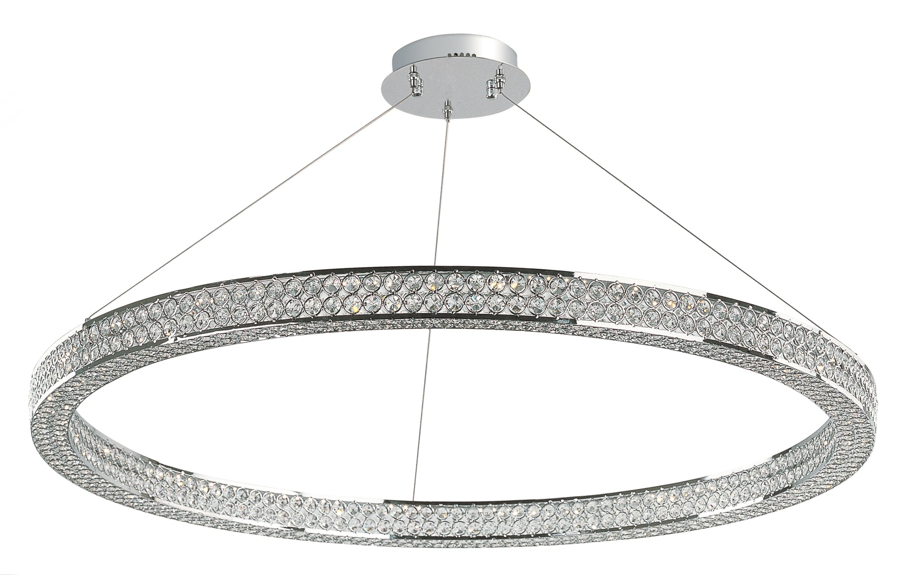 Frames of metal rings encased with Beveled Crystal Jewels, are finished in Polished Chrome. Suspended by cables as if floating In air, these rings cast rainbows of light when illuminated by the Integrated LED.